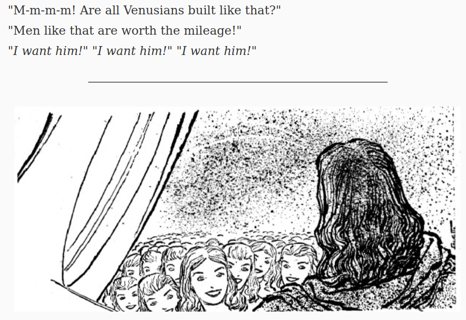 –especially seeing as 1) this was written in the ’50s, and 2) it turns out that, unfortunately for this poor sap, Venus is populated exclusively by buff, masculine, bishōnen men.