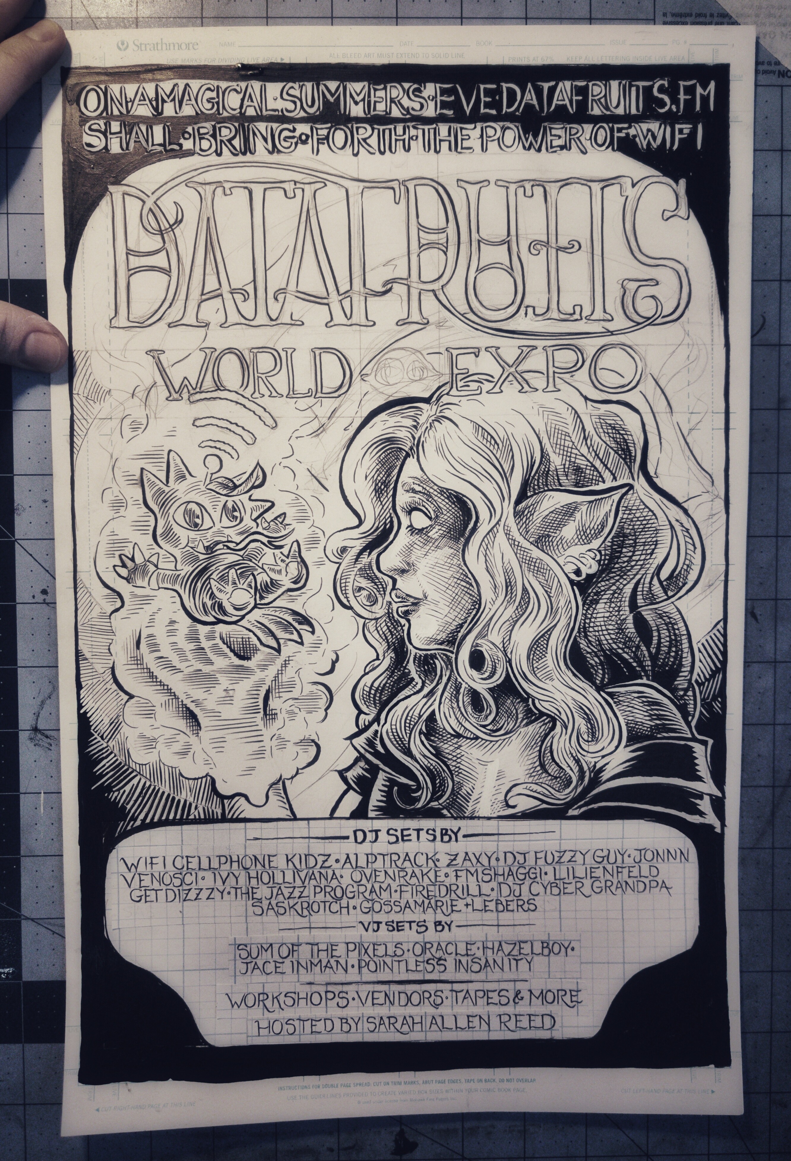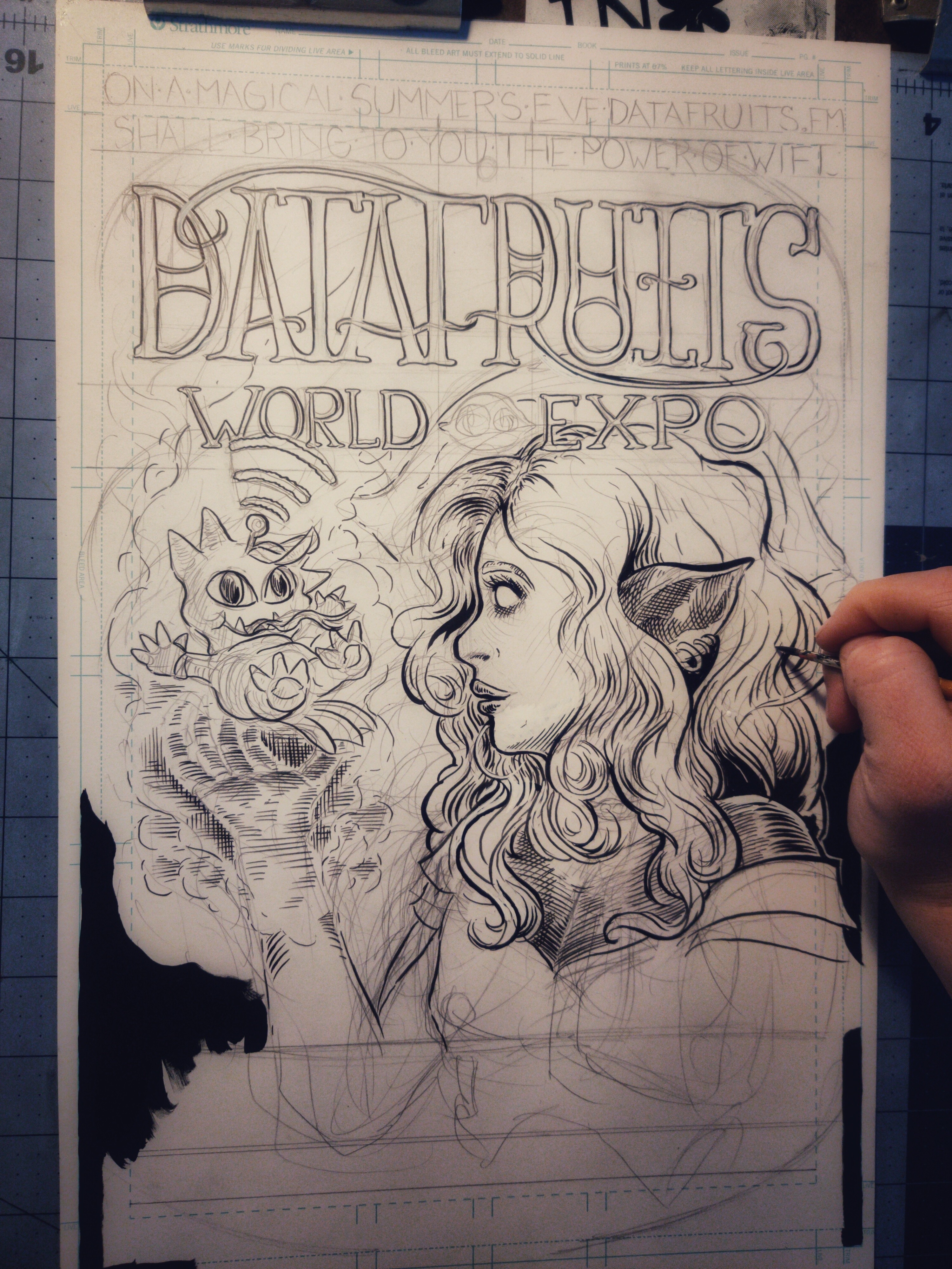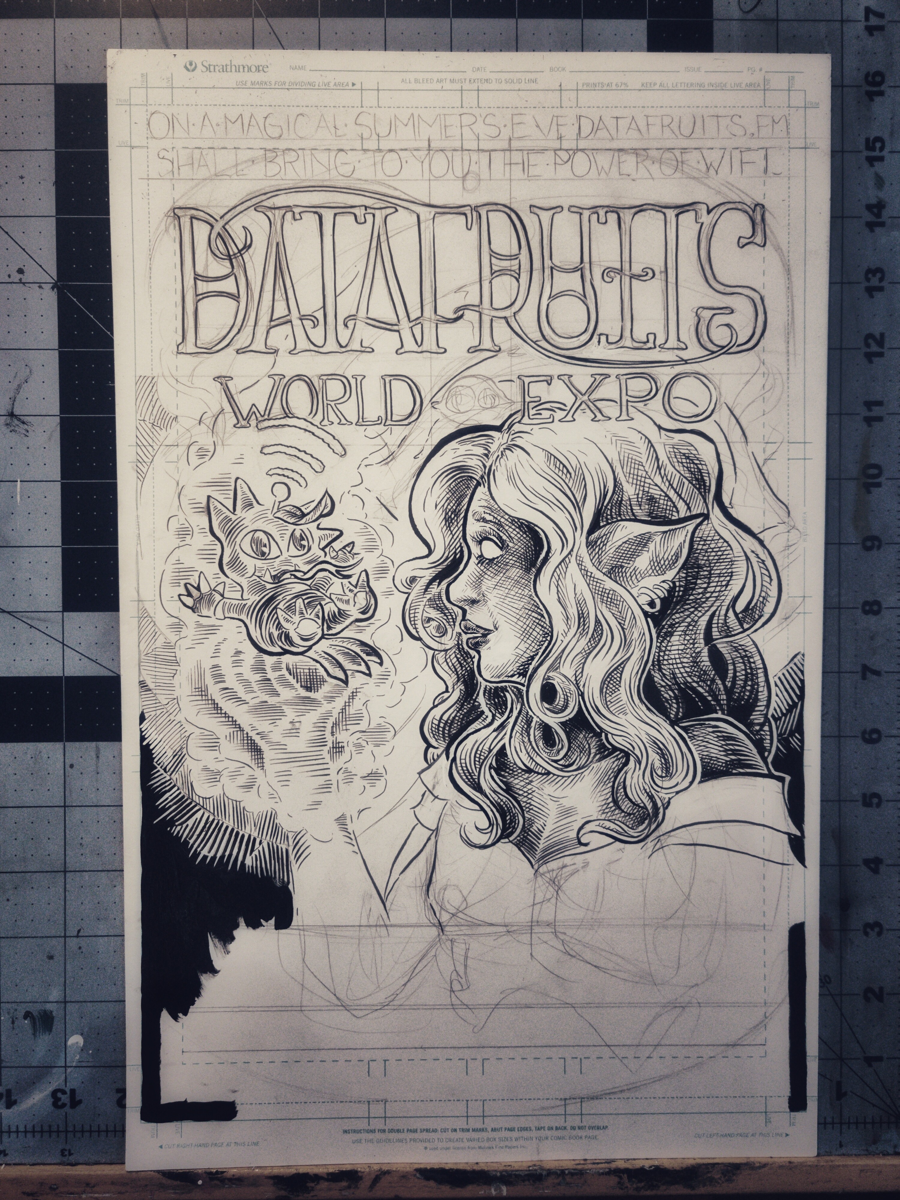 First and second pass of inks down. I wanna point out here that the lil' guy there in the witch's hand was designed by Datafruits' own Zaxy. His name is Beamsprout, if you were curious.