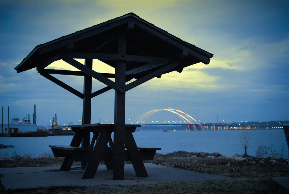 A picnic bench and the bridge lit up in all its LED glory.